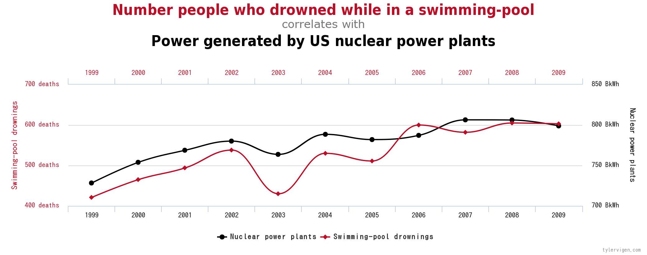 And according to http://www.tylervigen.com/spurious-correlations , there is a link between the number of movies Nickolas Cage appears in and the number of people who drown in swimming pools. And, there is a link between the number of deaths by drowning in swimming pools and the amount of power produced by US nuclear power plants. Therefor, to solve our problems with energy, we must produce more movies starring Nickolas Cage. I have the graphs to prove it. After all, correlation does imply causation. Although, the swimming pool drownings aren't both for the same place. I believe one is for only the US and the other is for the world.